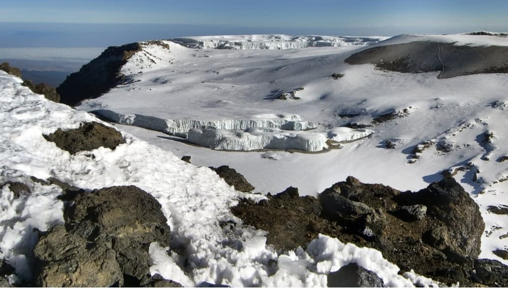 Crater Camp sits near the summit of Mount Kilimanjaro at around 18,800 feet above sea level. It lies between Uhuru Peak, which reaches 19,340 feet, and the Furtwängler Glacier. Climbers who stay here can sleep next to the glacier as it slowly disappears.